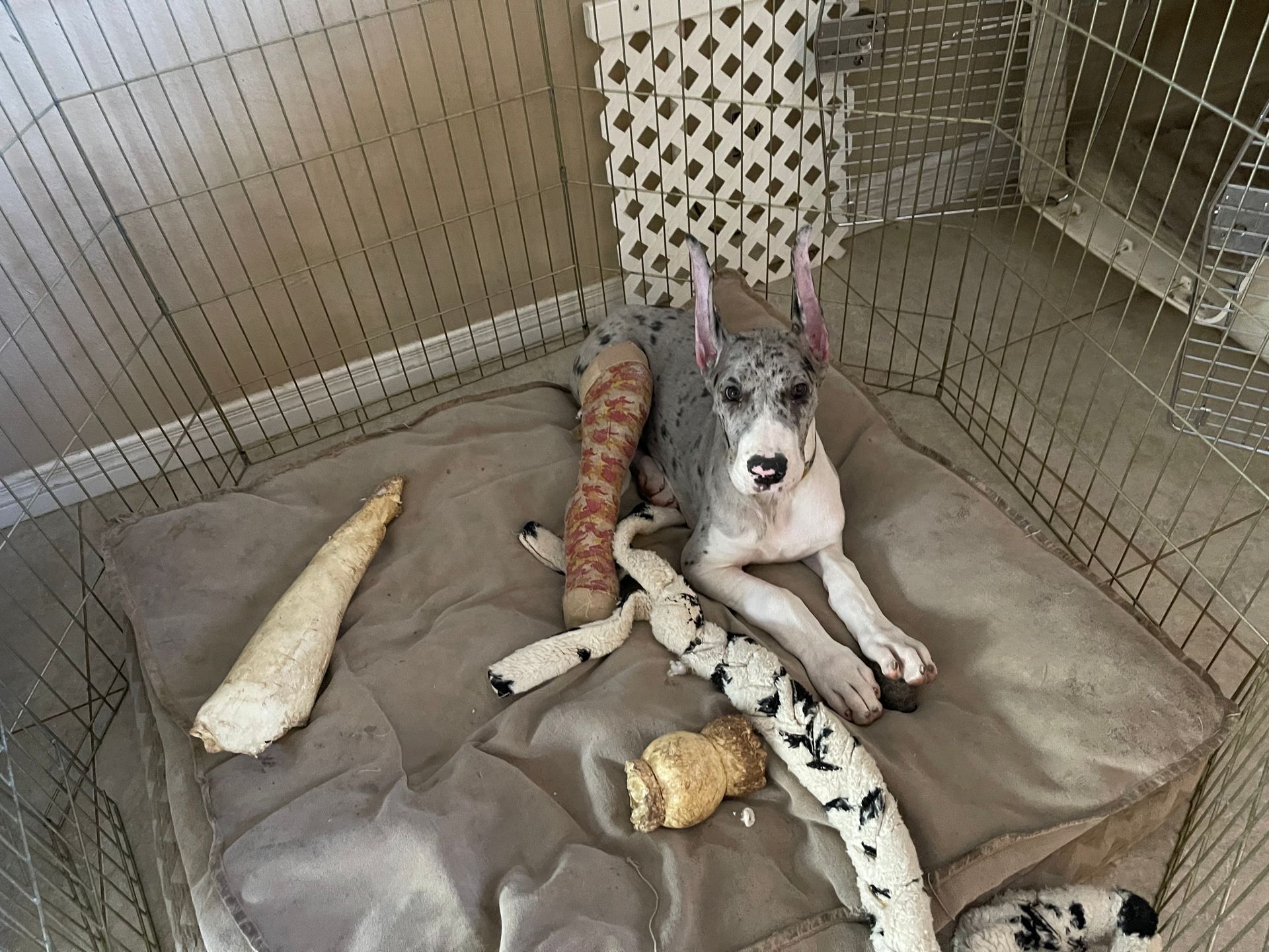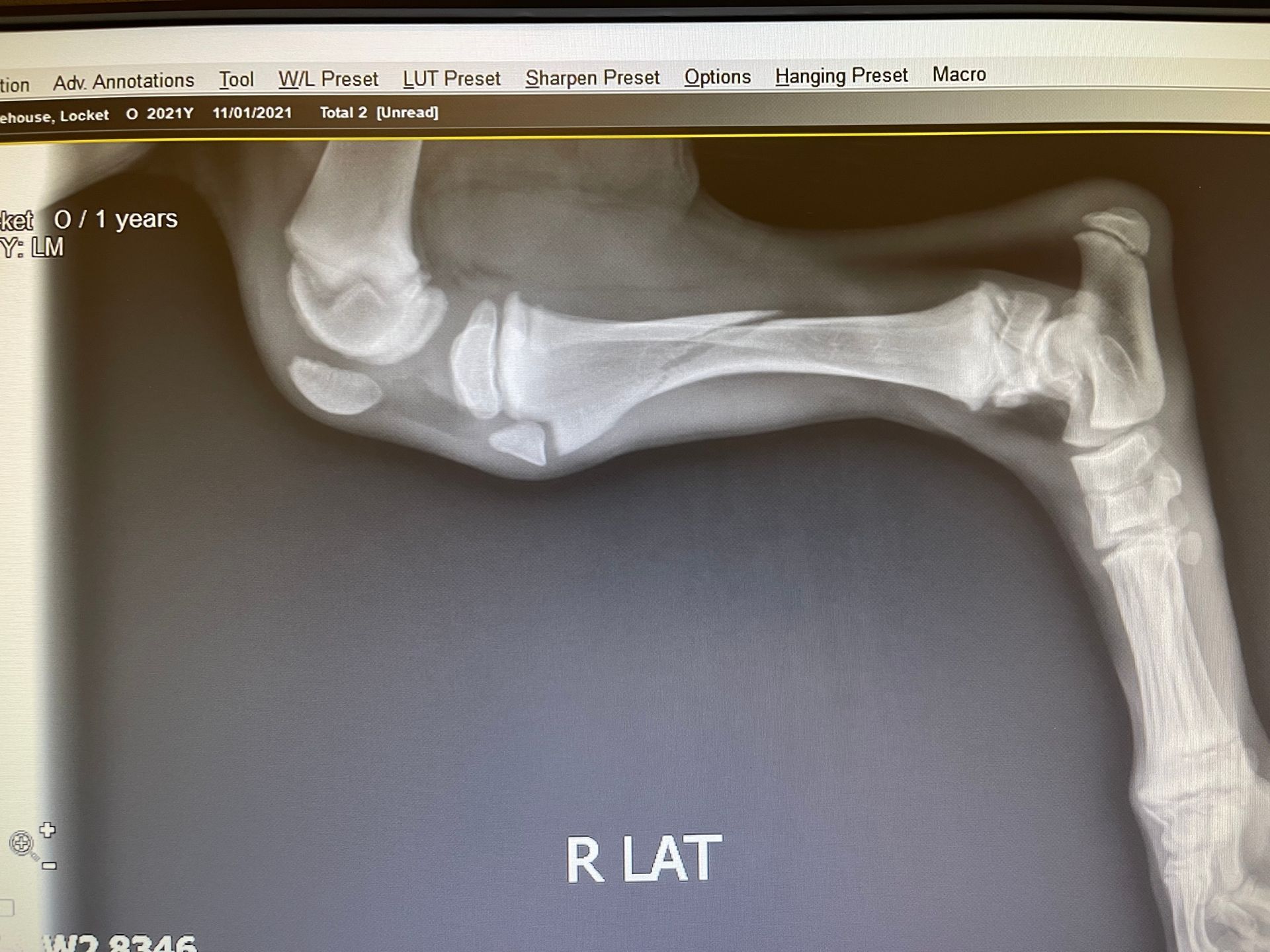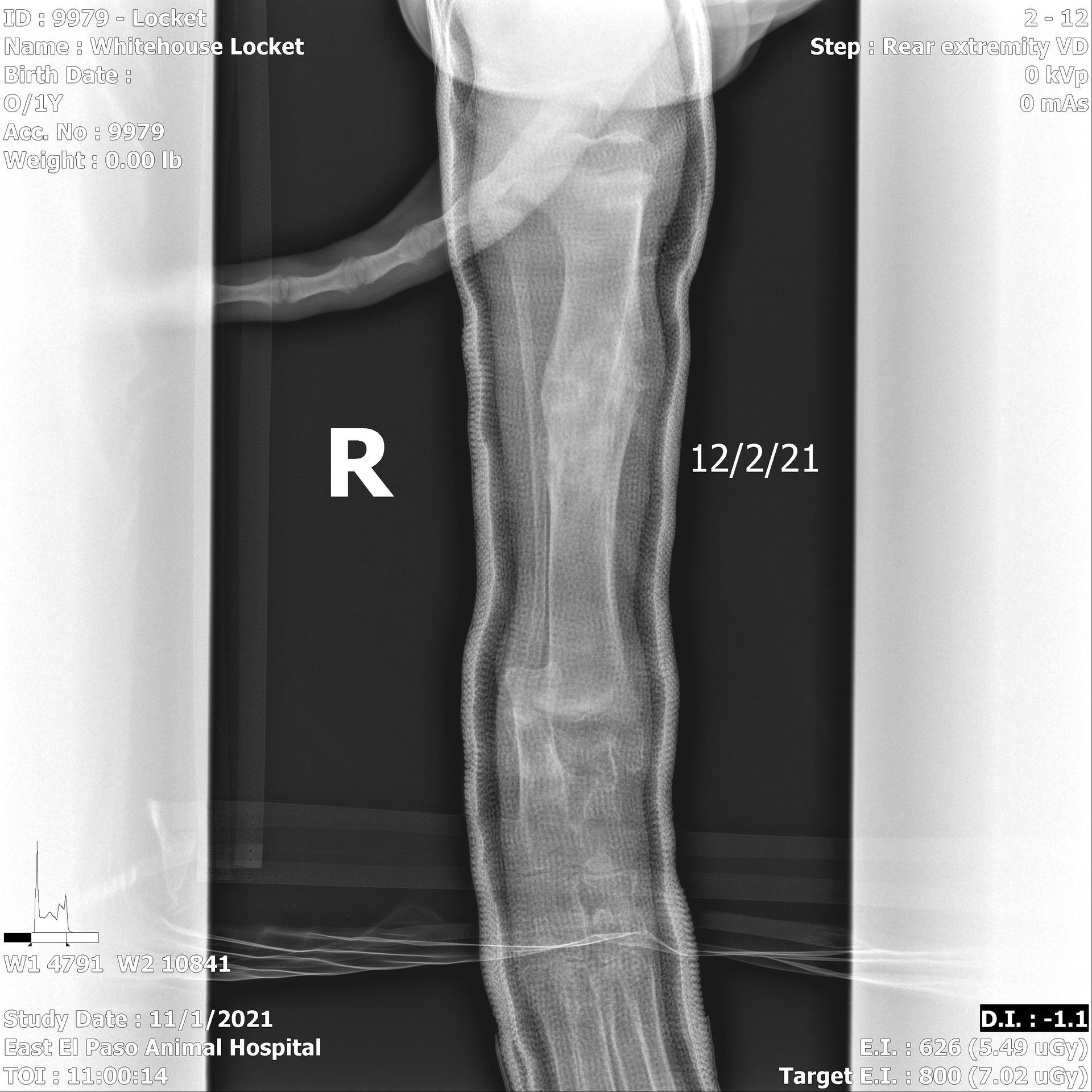 TRANSPARENCY is important! Our beloved Locket unfortunately broke her Right rear leg at 11 weeks of age on 11/1/2021. She was in a cast to her hip for over 6 weeks, on restricted activity several weeks more, and went through months of physical therapy. She recovered well enough to earn her Championship (winning both of her specialty majors on movement) and has continued to participate in lots of fun activities. Unfortunately, as is often the case with injuries like this, her hip joint was affected and there have been changes to the femoral head over time. OFA classified her as Mild UR (Mild Unilateral Right). We knew this was likely and we submitted her X Rays to OFA anyway (and checked the box!!)- both in the interest of transparency & education. For that reason we will also share photos & X Rays below.