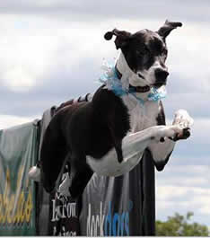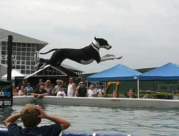 Charm is featured as a doc-diving wonder: at 6 she is titled at the master level in dock-diving and nationally competitive. She holds the breed world record as an "Air Dog"