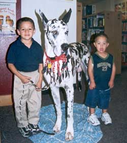 Picabo is the first Great Dane with an O-NAC, one of first to title in NADAC, and one of the first to also compete successfully in AKC agility. She was listed among the top ten in Danes in 2001. In 2002 she had a litter, so did not compete. In 2003 she began competing with her junior handler Joseph Whitehouse, and completed more titles in agility, as well as in Rally and Obedience. Proud mother of pups & grandpups also out competing, she had one litter which has gone on to many breed firsts: Versatility winning CH/CD daughter Frenchie, Orion with several breed firsts and a dog ranked in all sports for several years, National Specialty HIGH IN TRIAL daughter Rosie, #1 Dock-Diving daughter Charm. All this from her only litter!