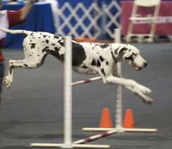 Orion is titled in AKC obedience, rally & agility, and in USDAA & NADAC agiltiy. He was invited to the 2006 USDAA Invitational, 2007 and 2008 AKC Agility Invitation, #1 Dane in NADAC in 2007